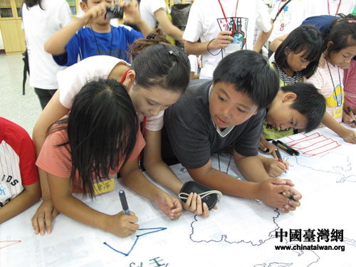 7月22日,广西大学和台湾大学学生和台湾南投县信义乡仁和小学学生共画“心目中的世博场馆”。图片来源:广西台办