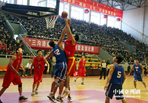 中国台湾网10月13日阜新消息 日前,“三沟酒业”海峡两岸男篮友谊赛,在辽宁省阜新市阜蒙县蒙古贞体育馆拉开帷幕。中华台北队、沈阳东进队参加比赛。