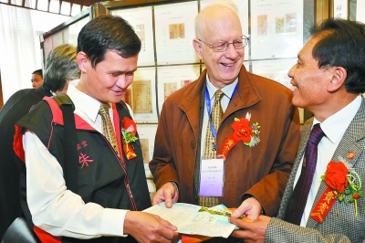 日前,在尤溪县“中华传统文化两岸集邮展览”展厅里,来自台湾新竹县的朱金得(左)与观展嘉宾交流集邮心得。