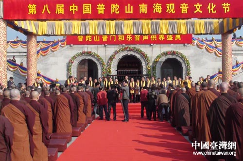 中国台湾网11月5日舟山消息 今天上午,第八届中国南海观音文化节在浙江普陀山南海观音大佛广场隆重开幕。台湾南鲲鯓代天府和台湾灵鹫山等佛教交流团共200余人应邀参加文化节。