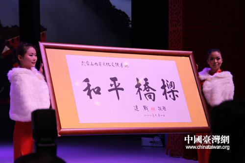 中国国民党荣誉主席连战题词:“和平桥梁”。(中国台湾网 李丹 摄)