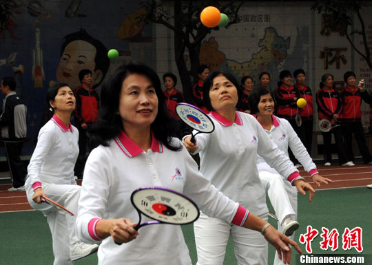12月4日,海峡两岸柔力球、健身气功交流活动在福州群众路小学举行。图为参加该交流活动的86名台湾柔力球爱好者做精彩表演。中新社记者 刘可耕 摄