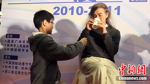 “我画龄很长,画技很高。以后,我要和蔡志忠老师一起‘切磋’漫画技巧。”今天,浙江杭州举办的“美猴奖·我是动漫王”拜师仪式上,台湾漫画大师蔡志忠收下杭州11岁小弟子蔡和睿,这位子弟颇有狂气,“切磋”两字让大师面露欣赏之色。回想起往事,蔡志忠由衷说道:“在我小时候,学漫画是不被社会广泛认可的。杭州能如此鼓励小朋友画漫画,这让我很感动。”
