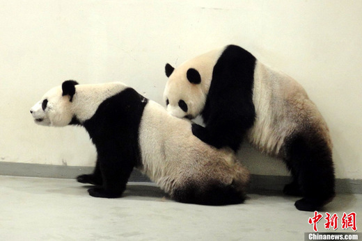 在大熊猫特展馆,贾治邦等人隔着厚厚的玻璃墙,仔细观看“团团”、“圆圆”的一举一动。已来台定居两年多的“团团”、“圆圆”,虽然刚刚经历自然交配体验及人工取、受精,依然活力四射。母大熊猫“圆圆”还纵身爬上了一棵树干,引来一阵赞叹声。