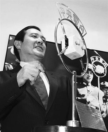 2008年马英九视察“央广”时,站在蒋介石曾经使用的麦克风前听取简介