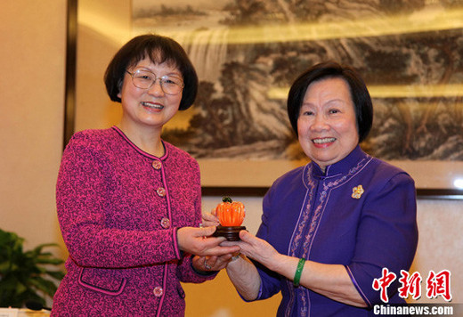 3月22日上午,正在台北参访的上海妇女代表团来到台湾妇联会办公楼,拜会了海基会已故前董事长辜振甫的遗孀、台妇联会主委辜严倬云女士。图为辜严倬云(右)向张丽丽(左)赠送南瓜造型工艺品。中新社发 符永康 摄