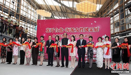 3月21日下午,由上海市妇女联合会主办的“花开台北·海派女性风采展”在台北开幕,沪上112位杰出女性代表身着各式旗袍亮相花博会流行馆,观看“都市光影中的她”摄影展及特色演出,并与相聚在此的台湾妇女会总会姐妹们畅叙友情。图为中共上海市委常委、宣传部部长杨振武(右十),上海市妇联主席张丽丽(右四)等共同为展览剪彩。中新社发 符永康 摄