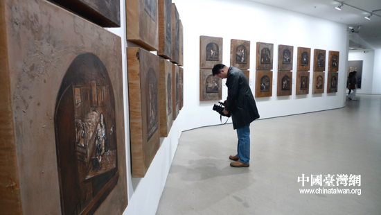 王家增的作品以凝重浑厚的面貌,描绘出对现代人遭受城市化挤压困境的细微观察(中国台湾网 李徽 摄)