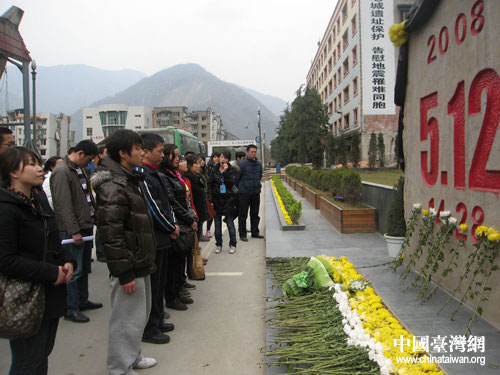 眼前的北川县城遗址,扭曲的楼体,撕裂的路面,掩埋了无数生命的断壁残垣令人触目惊心。在“5.12”纪念碑前列队致哀,向遇难者深深三鞠躬,不少同学都红了眼眶。“台湾是地震多发带,所以我们特别能体会灾区人民的伤痛。”就读于成都中医药大学的黄同学说,“灾难给我们带来巨大创痛,也让我们空前团结。”