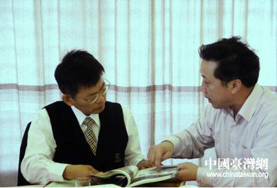 浦东新区台办副主任范桂国向杨秋兴介绍浦东情况。图片来源:浦东新区台办