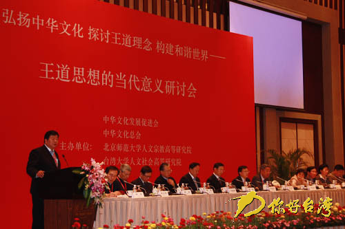 4月22日上午,“弘扬中华文化探讨王道理念构建和谐世界——王道思想的当代意义研讨会”在江苏省南京市开幕,海峡两岸及香港地区专家学者和企业界、科技界等有影响的嘉宾100余人,就两岸如何合作弘扬中华传统文化、王道思想的当代意义、王道思想对构建和谐世界的启示等进行研讨。中共江苏省委副书记朱善璐,中台办、国台办副主任孙亚夫,中华文化发展文化促进会副会长辛旗先后在开幕式上致辞。前全国人大常委会副委员长、中华文化发展促进会会长许嘉璐和台湾中华文化总会会长刘兆玄出席开幕式并致辞和专题演讲。