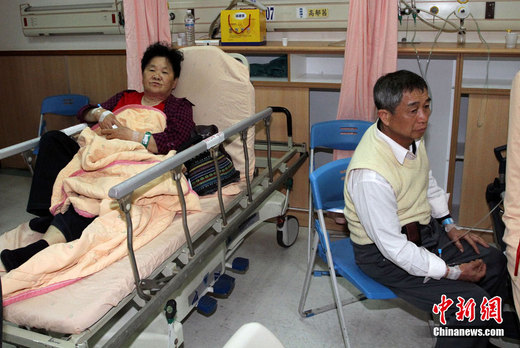 4月27日,台湾阿里山景区发生小火车翻车事故,多名伤者送往嘉义基督教医院,受到惊吓及轻伤的旅客在观察室接受治疗。陈毅伟 摄 图片来源:“中央社”