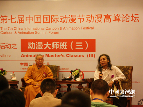 4月29日,台湾著名漫画家蔡志忠出席第七届中国国际动漫节,与少林寺方丈释永信一起“禅说动漫”。(中国台湾网 李丹 摄)