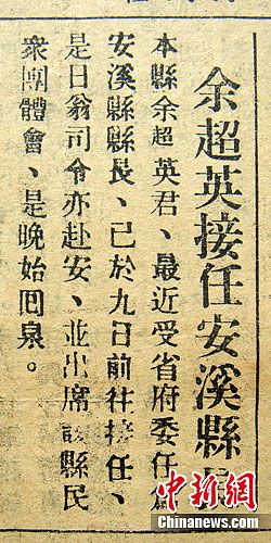 在这份民国二十三年(1934年)1月13日的《崇道报》上,刊载着这则《余超英接任安溪县长》的消息:“本县余超英君,最近受省府委任为安溪县县长,已于九日前往接任”。
