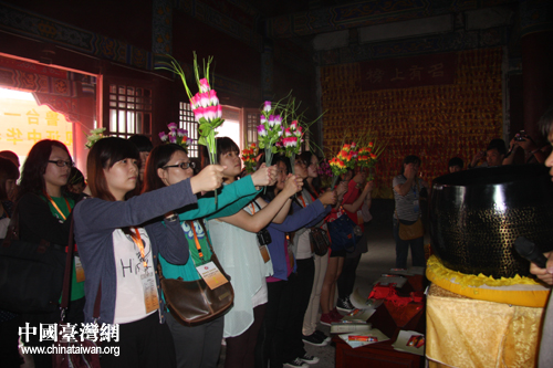 台湾学生手持鲜花参拜孔子像。(图片来源:泰安市台办)