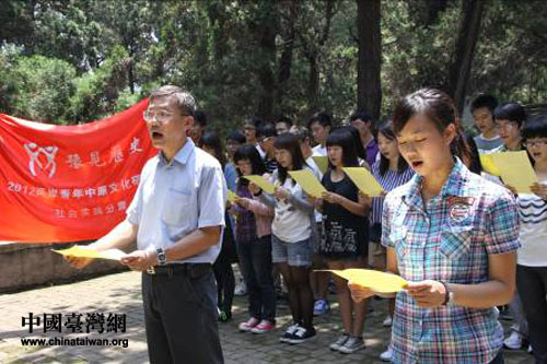 中国台湾网7月12日平顶山消息 “大江东去,浪淘尽,千古风流人物,故垒西边,人道是,三国周郎赤壁,……”这不是教室学生们的读书声音,它是两岸青年学子在“三苏坟”前齐诵苏东坡著名的《念奴娇·赤壁怀古》。7月11日,2012年“豫见历史——两岸青年中原文化研习营社会实践分营”一行走进平顶山郏县三苏园,在这里举行了一场别具风格的两岸青年文化交流活动。