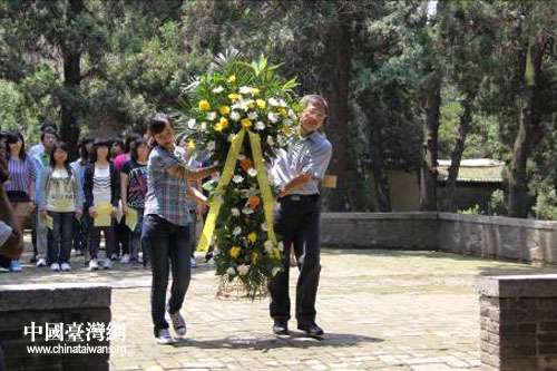 台湾大学生领队向“三苏坟”敬献花篮。(图片来源:河南省台办)