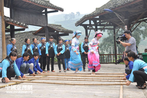 踏着节拍跳起竹杆舞。(贵阳市台办 胡珊珊 摄)