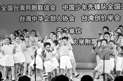纪念活动中最精彩的部分莫过于穿着七色服饰的两岸小天使们同台合作表演。“两岸和平,由我做起!”全场齐呼的口号就像两岸和平小天使共同的约定。图片来源:人民日报海外版