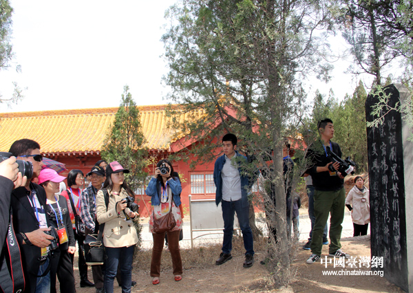 已故国家主席刘少奇之子刘源,全国政协副主席、民革中央常务副主席周铁农均为始祖苑题写过碑文。图为参访团记者正在拍摄已故国家主席刘少奇之子刘源所提碑文。(中国台湾网 普燕摄)