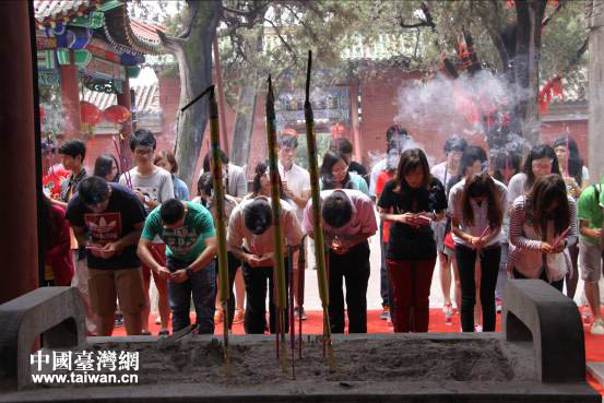 中国台湾网7月10日新乡消息 7月9日上午,参加“跨越海峡 相约中原”台胞青年夏令营的台湾嘉义大学的同学们来到新乡卫辉市比干庙,祭拜林姓始祖比干。
