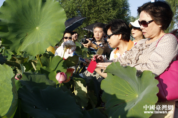 台湾雅乐合唱团参观莲花湖湿地公园中的怡荷园时,与最盛时能有三千多花瓣的名品荷花留影。(中国台湾网 普燕 摄)