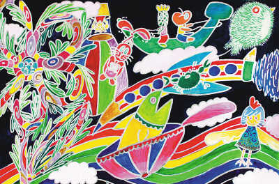 这个奇怪的天堂里有飞翔的兔子,也有准备出航的水果们,还有躲在雨伞里的鱼……皓茵小朋友,你是怎么想的啊?