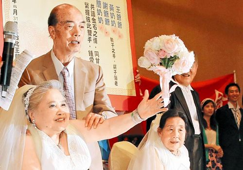 两对超过50年的长辈举办“世纪婚礼”,高龄8旬的谢爷爷与老伴简奶奶做到“执子之手、与子偕老”的爱情见证,简奶奶并抛出手中鲜花绣球给现场未婚女性。图片来源:台湾《中国时报》