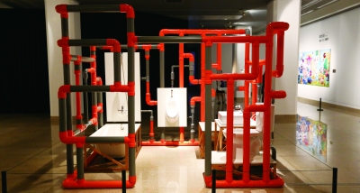 除了两岸艺术家作品间的交互设置,作品与观众的交流和互动也可圈可点。大陆艺术家许仲敏的《楼》不断闪着眩目的蓝光,当观众走近它时,这件庞大的互动装置会自动旋转起来,八层“楼”上的“众生”形象也在旋转中变幻,展示了艺术家对生命轮回的新认识;台湾艺术家蔡坤霖的装置作品将家庭日常用具用水管连接起来,当观众触碰水龙头开关时,就会听见水管发出的声音,从而产生不同的视觉想象与体验;大陆艺术家吴珏辉的影像作品,让观众看到被拍摄的小物品在屏幕上放大成如山水画般的风景空间,走近它,观众便仿佛置身于“山水之间”……