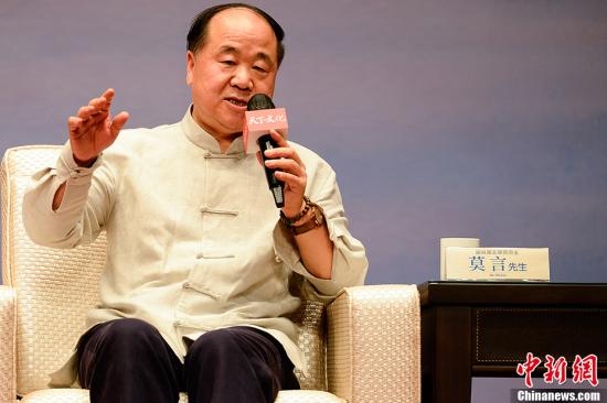 资料图:9月15日下午,莫言在台湾高雄佛光山大觉堂与佛光山开山宗长星云大师对话,以“看见梦想的力量”为题,分别从“文学家的梦想”、“宗教家的梦想”观点出发,同台交流,共谈梦想的力量。这是莫言第六次来台湾,也是他获得诺贝尔文学奖后首次赴台。中新社发 刘震 摄