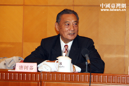 北京联合大学台湾研究院名誉院长、前海协会常务副会长唐树备在研讨会上讲话。(中国台湾网 张洁 摄)