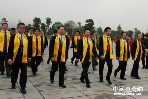 海协会副会长李亚飞代(左三)、湖南省省长助理袁建尧(左二),台湾中华神农大帝协进会常务顾问、东莞台商子弟学校董事长叶宏灯(左一)等两岸相关负责人步入炎帝陵祭祀广场。(中国台湾 高斯斯 摄)