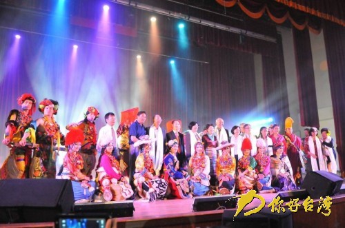 四川民族歌舞赴台交流团在彰化举行第四场巡演,图为演出结束后交流团成员合影。(你好台湾网 图)