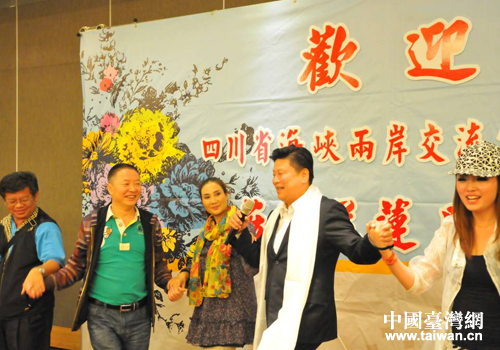 花莲县长傅崐萁(右二)设宴欢迎四川民族歌舞赴台交流团一行,席间与交流团一行手拉手跳藏族歌庄。
