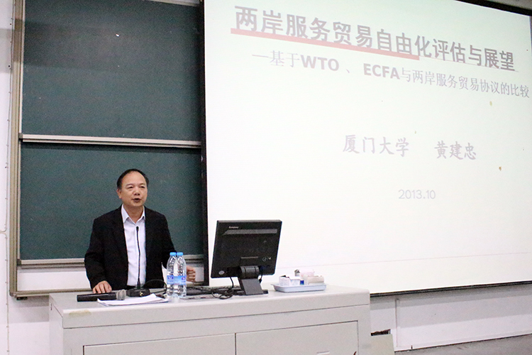 11月13日下午,厦门大学经济学院教授、博士生导师黄建忠,应邀来院开展题为“两岸服务贸易自由化的评估与展望——兼谈闽台服务贸易合作”的专题讲座。