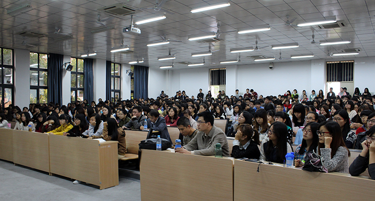 我院副院长王知桂教授,国际商学系领导韦樟清、张清国、师大经济学院部分研究生以及我系国贸专业各年级学生代表等共350多人到场聆听讲座。