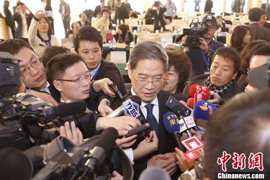 12月22日,张志军出席“2013海峡两岸媒体前瞻论坛”被记者围堵采访。当日,“2013海峡两岸媒体前瞻论坛”在北京举行,中共中央台办、国务院台办主任张志军出席论坛开幕式并致辞。中新社发 盛佳鹏 摄