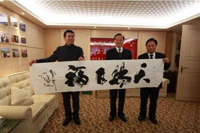 参访团成员、大陆著名工艺大师周国桢向连战赠送了他的得意之作雕塑作品《马到成功》;参访团成员、当代榜书家赵昌林向连战赠送了榜书作品《天赐百福》。(记者吴亚明、王连伟)