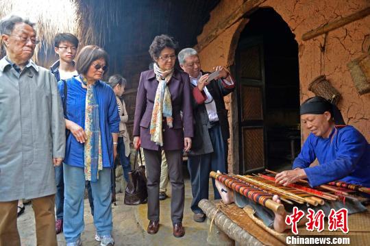 两岸艺术家在景区观看黎族阿婆织黎锦。 骆云飞 摄