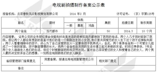 3月13日下午,@湖南卫视芒果捞微博爆料称:“才播完不到一年的《两个爸爸》就要被内地翻拍了,由出品过《流星雨》系列的北京春秋风云影视策划有限公司报备……”并上传“电视剧拍摄制作备案公示表”。此消息曝光后,网友大规模提议剧中的爸比和爹地分别由张亮和田亮来出演,森碟演女儿。