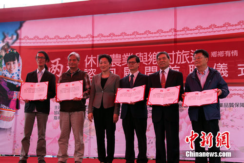 4月1日,“两岸乡村休闲旅游嘉年华”在台湾苗栗县飞牛牧场开幕。活动由福建省旅游协会、台湾乡村旅游协会、台湾休闲农业发展协会、台湾旅行业品质保障协会联合主办。图为福建方面聘任台湾休闲农业发展协会顾问邱涌忠、台湾休闲农业学会创会理事长陈昭郎、台湾乡村协会理事长郑健雄等人为两岸休闲农业与乡村旅游咨询顾问,希望专家学者能够为福建乡村旅游发展献计献策。(左3)为福建省旅游协会会长朱华。
