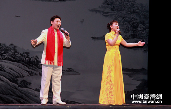 4月8日晚,由北京市文联、北京市台办、北京市新闻办主办的第十四届京味文化之旅首场演出在台中市中兴堂举办。图为歌曲对唱《老北京叫卖声》。(中国台湾网 高斯斯 摄)