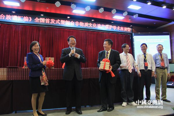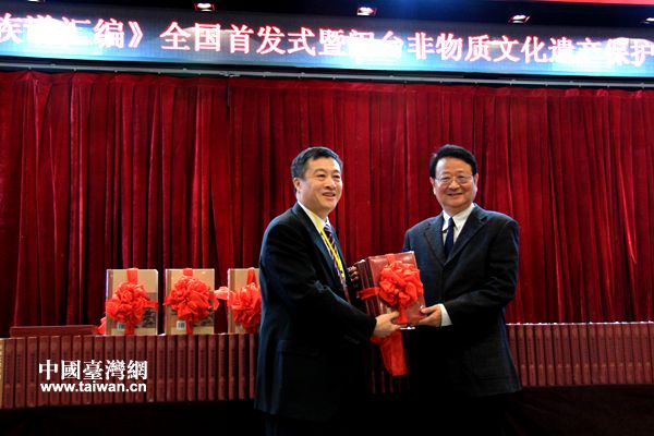 《台海文献汇刊》、《闽南涉台族谱汇编》29日在京首发,图为全国台联会长汪毅夫接受闽南师范大学赠书(中国台湾网 李徽 摄)