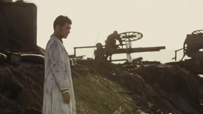 演员金城武在《太平轮:乱世浮生》演军医,站在尸横遍野的战场,忧郁眼神流露对战争的无奈,并与日本演员长泽雅美陷苦恋。 “中央社”图