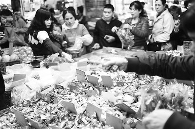 澳门:人们在澳门义字街的年货市场购买食品(2月9日摄)。新华社记者 张金加摄