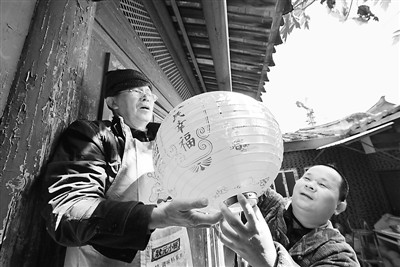 福建:在福建泉州,陈建国(右)和邻居一起在“老范志”大厝里挂上新灯笼,迎接新年到来(2月13日摄)。新华社记者 魏培全摄