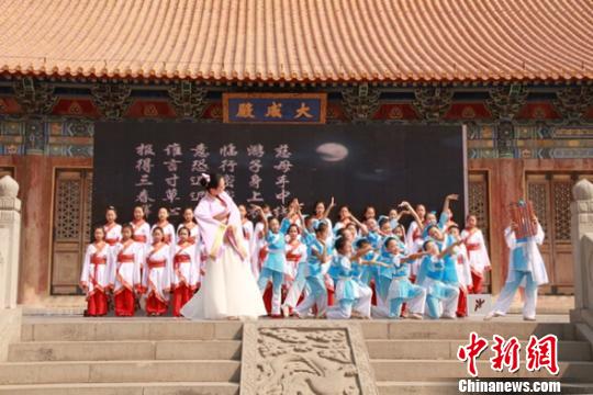 “和谐中华”第六届海峡两岸经典文化推广会演开幕式现场济南府学文庙大成殿,图为济南市小学生表演《游子吟》。 曾洁 摄