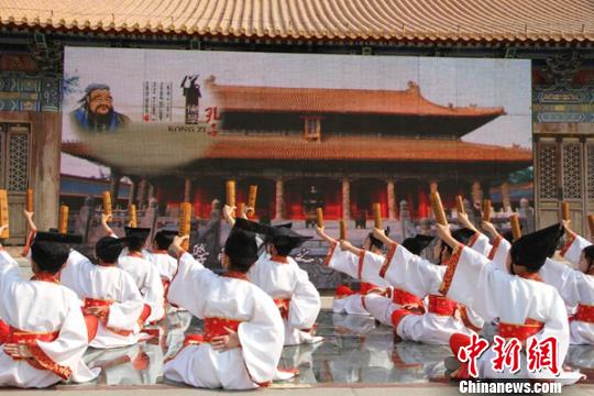 济南市小学生当日还展演了传统礼义及儒家经典文艺节目:手持弓箭,表演射礼;翩翩起舞,演绎《游子吟》;宋服竹简,朗诵儒家典籍《大学》名句……形式多样的展演立体化地呈现了中华经典文化故事。