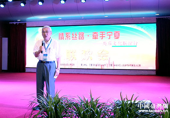 交流团台湾团团长、台湾世新大学教授曾永义在闭幕联谊会上致辞,并朗诵了宁夏行创作的诗词。(中国台湾网 普燕 摄)