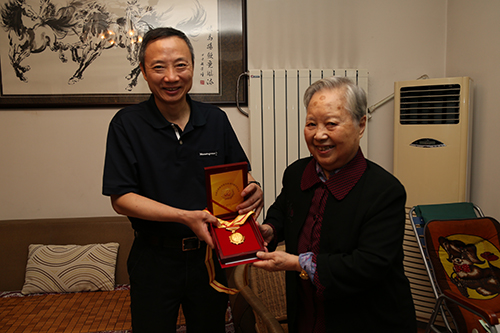 四川省台办主任周敏谦向彭宗萍同志发放中国人民抗日战争胜利70周年纪念章。